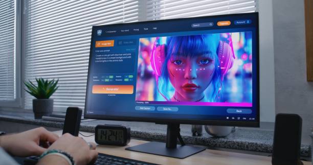 Adult man enters prompt in AI image generator app on personal computer. Artificial intelligence chatbot generate detailed high-quality image of cyberpunk girl. From text prompt to generated photo.