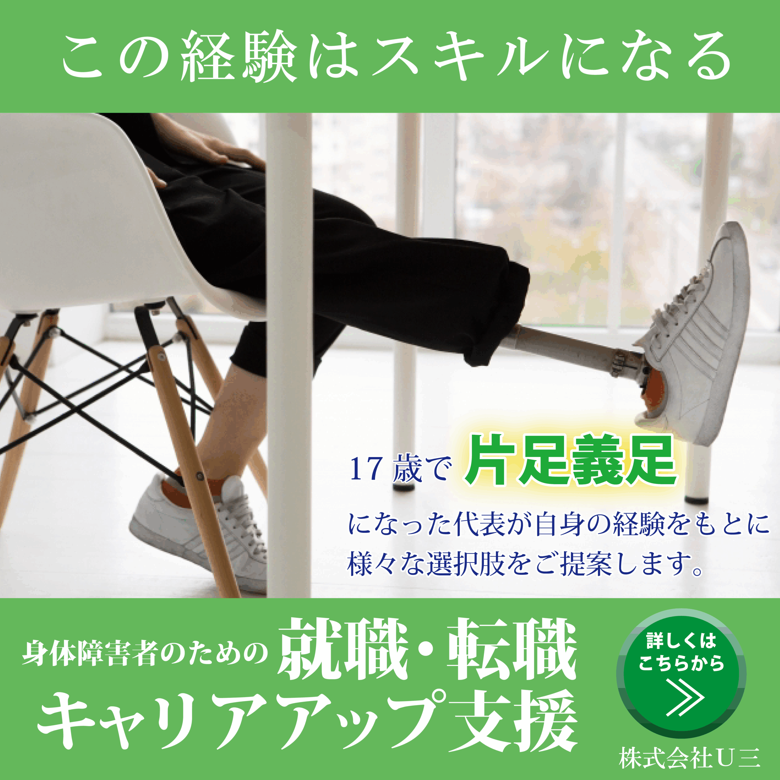 株式会社U三(ユウサン)は、身体障害に特化した就職・転職・キャリアアップ支援のプロフェッショナルです。代表自身が当事者であることから、言いづらさを理解し、現実的な解決策へつなげる知見が豊富。