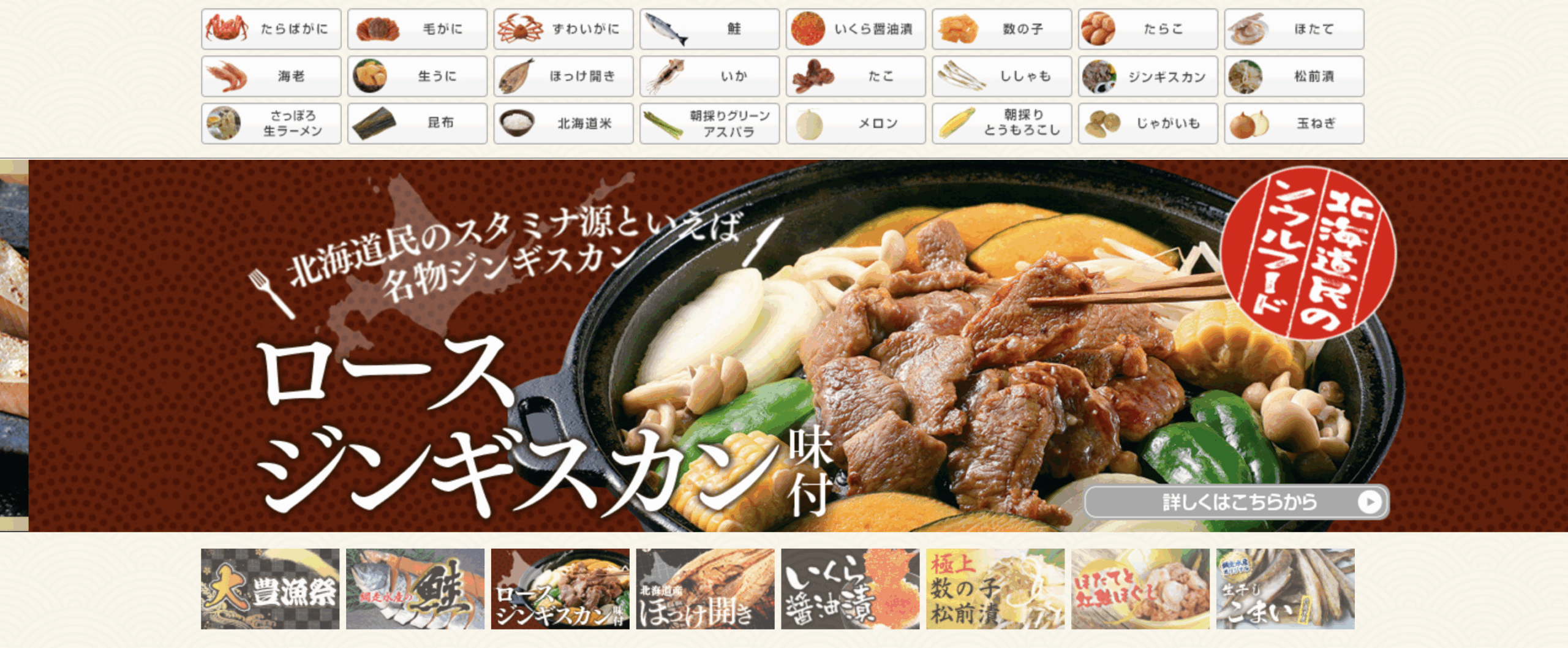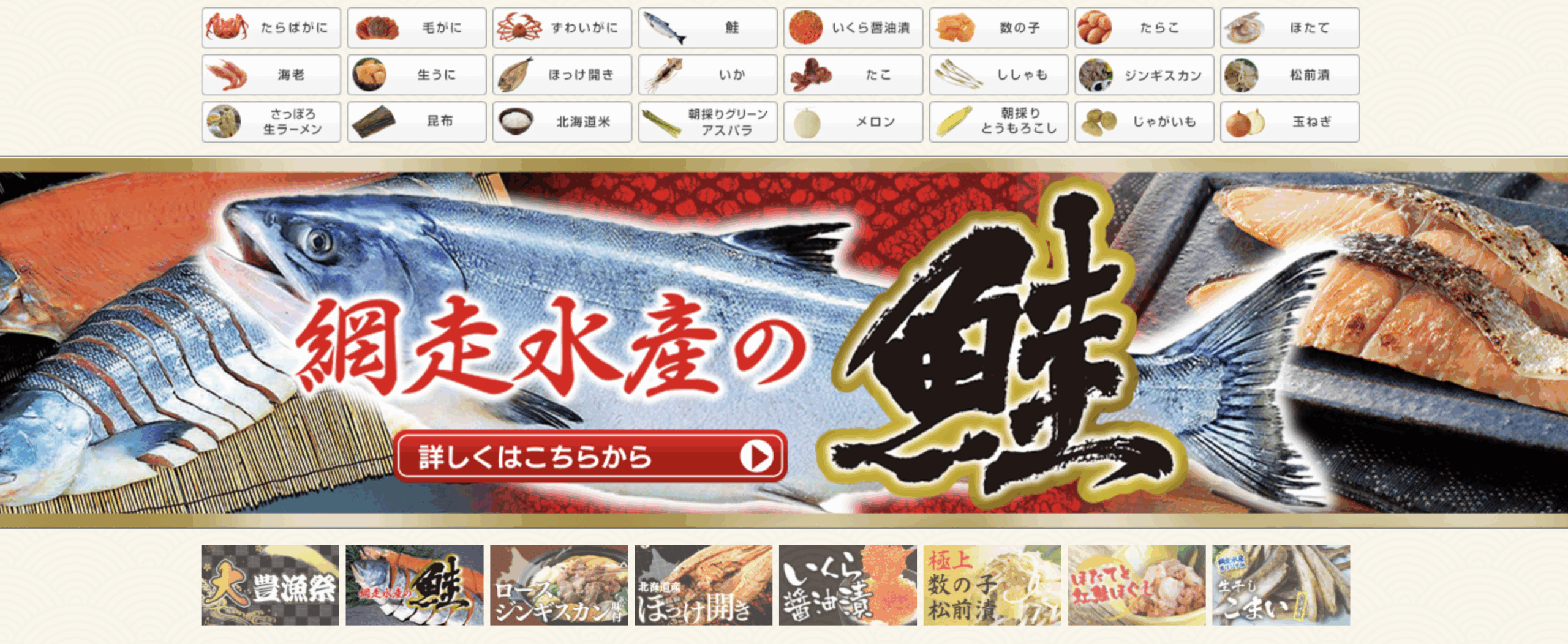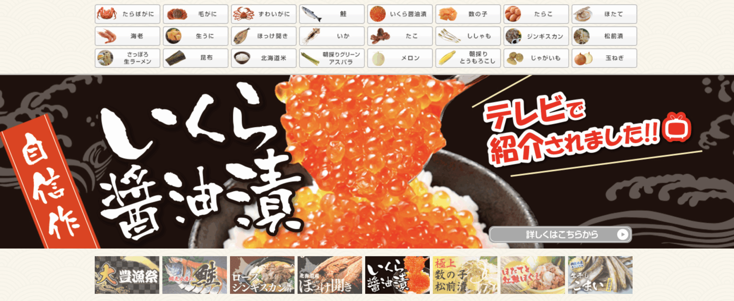 蟹(カニ)、いくら、ホタテ、サーモン、干物、珍味、肉類まで幅広いラインナップが揃っており、「北海道の味を自宅で楽しみたい」という全国のお客様から長く愛されています。