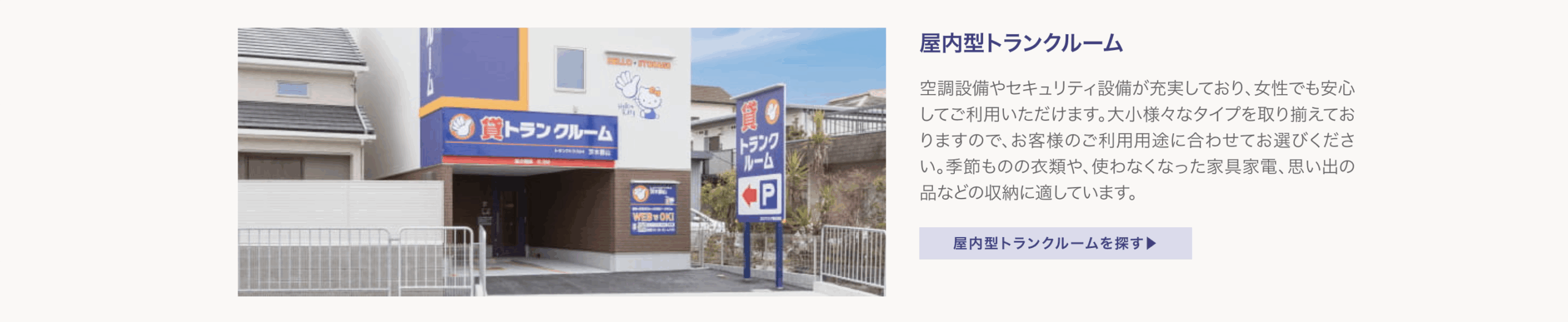 全国に物件を展開しており、利用者数も圧倒的。自宅の収納スペース不足、季節用品や趣味の道具の保管、引っ越し時の一時保管など、幅広い用途で選ばれています。