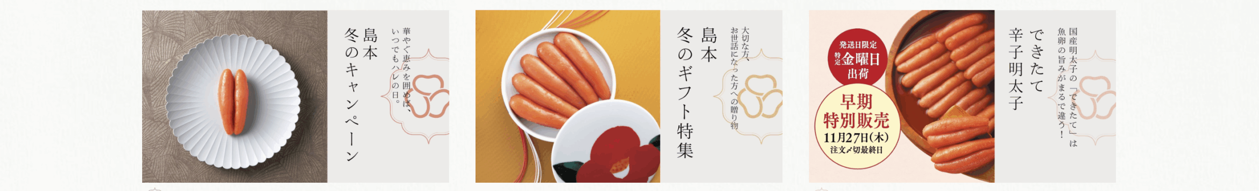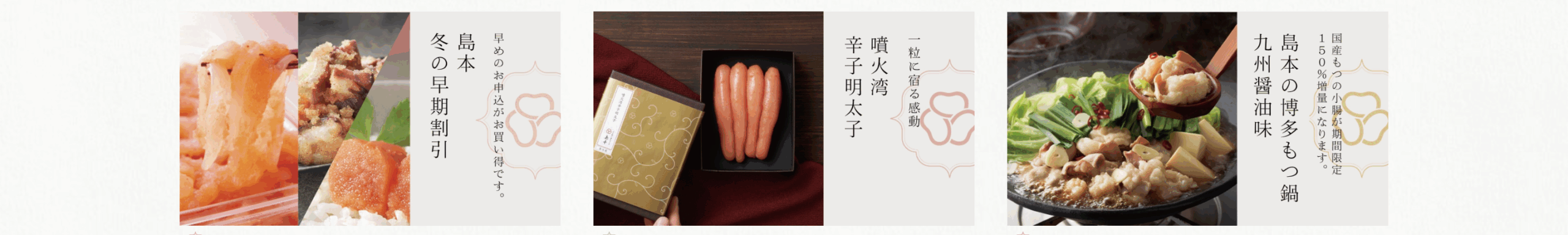 島本は明太子だけでなく、明太子を使った食品も人気。贈答用・家庭用の両方に対応した豊富なラインナップが魅力です。