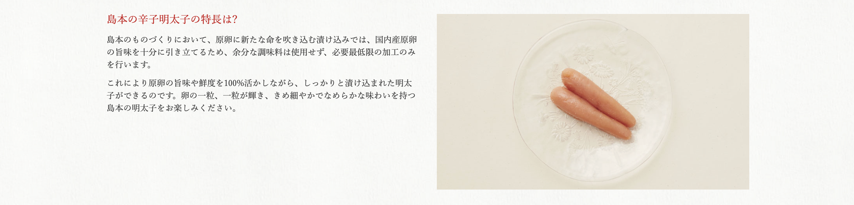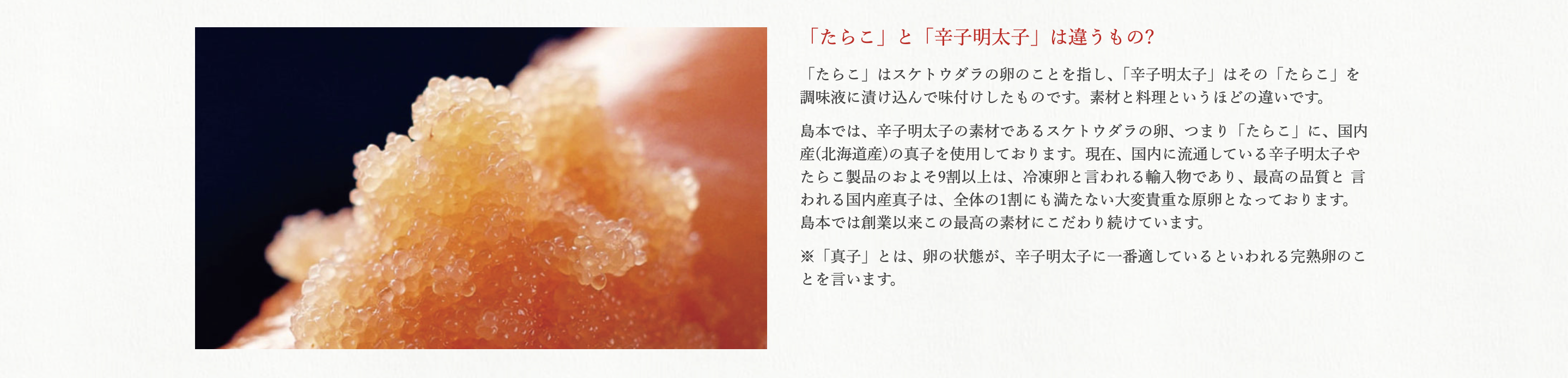 明太子の多くは海外産たらこを使用していますが、島本は創業当時から“安心で美味しい国産原料”にこだわり続けています。
