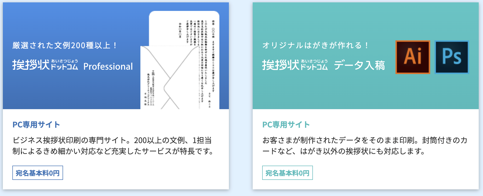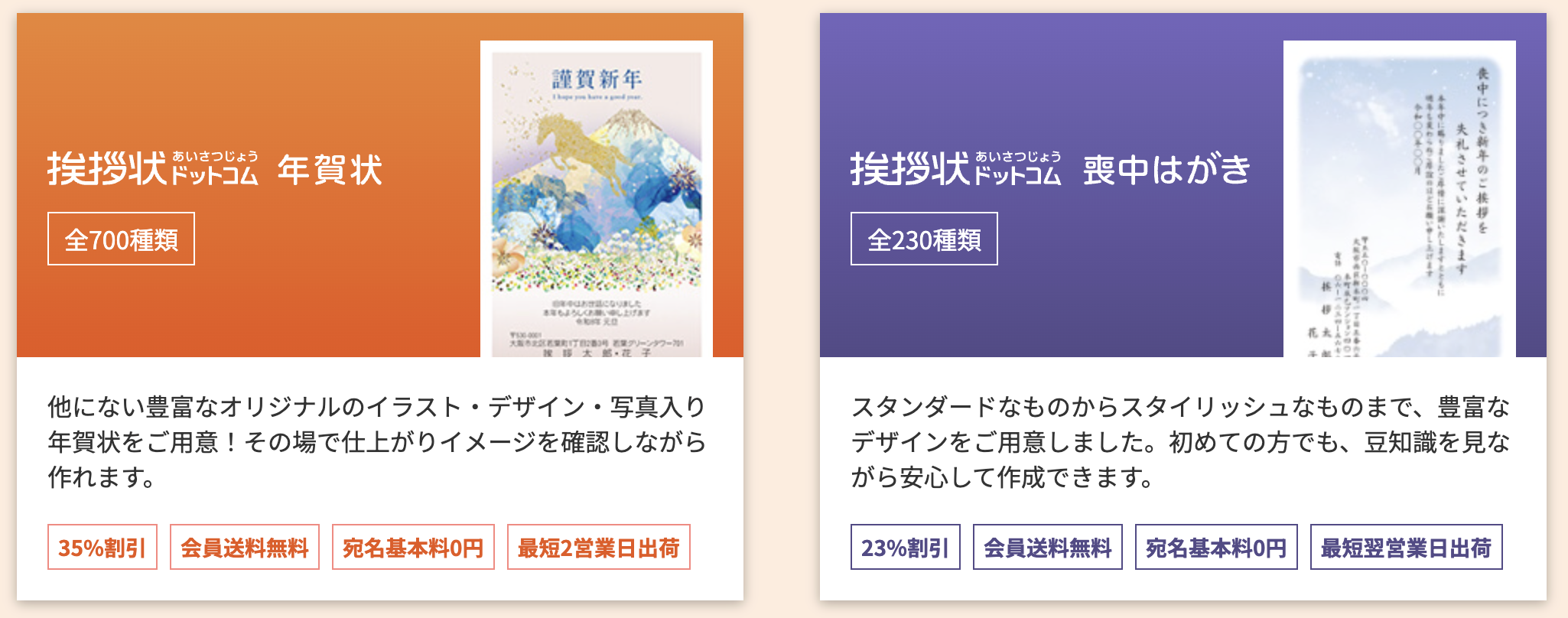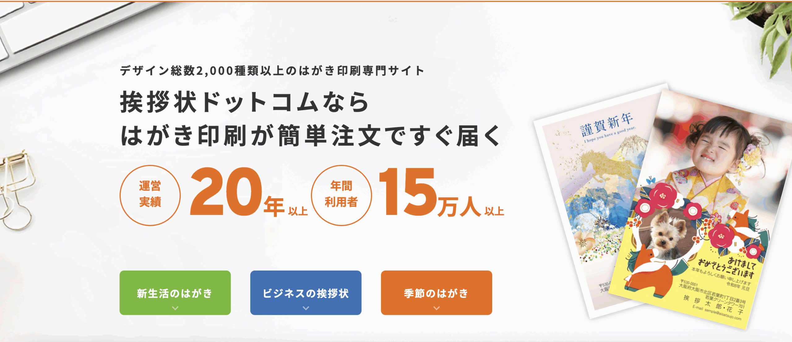 挨拶状ドットコムは、日本最大級の規模を誇る年賀状・挨拶状の印刷サービスです。