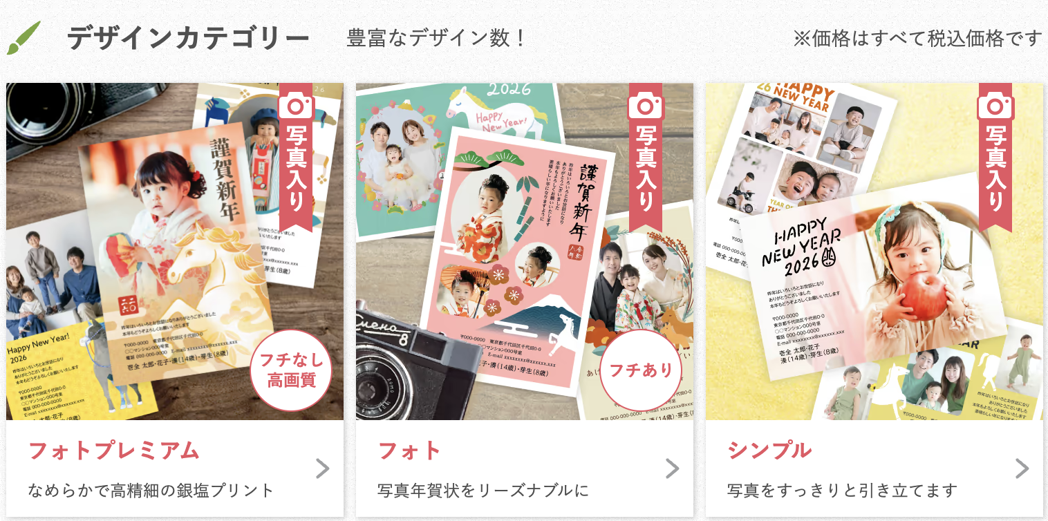 ふみいろ年賀状では、デザインバリエーションも非常に豊富。