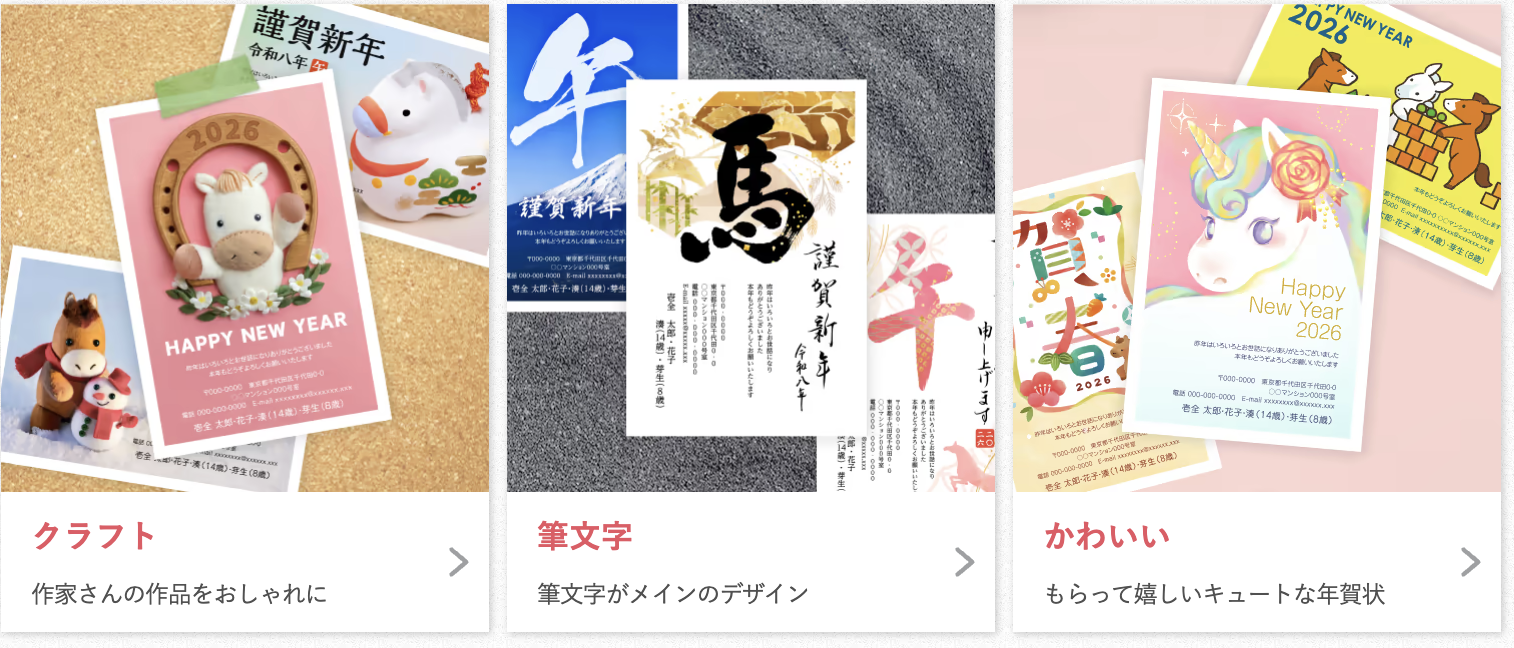 「かんたん」「速い」「安心」をコンセプトに、スマホ・パソコンから誰でも気軽に年賀状を作成できます。