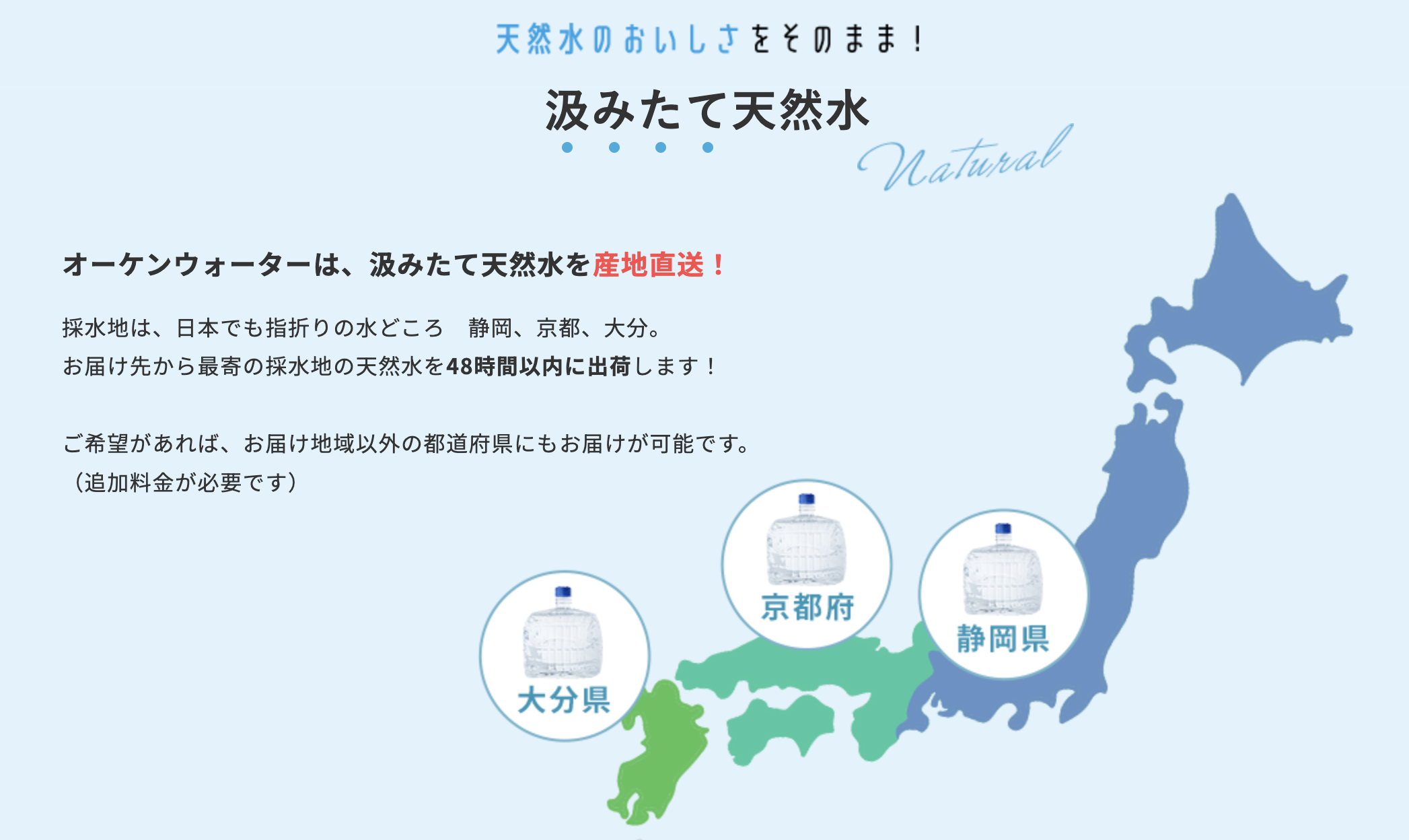 オーケンウォーターは、国産の天然水を自宅まで届けてくれる宅配水サービスです。採水地の自然環境を活かした天然水を使用し、日常の飲み水としてはもちろん、料理や赤ちゃんのミルク作りなど幅広い用途に使いやすい点が特長です。