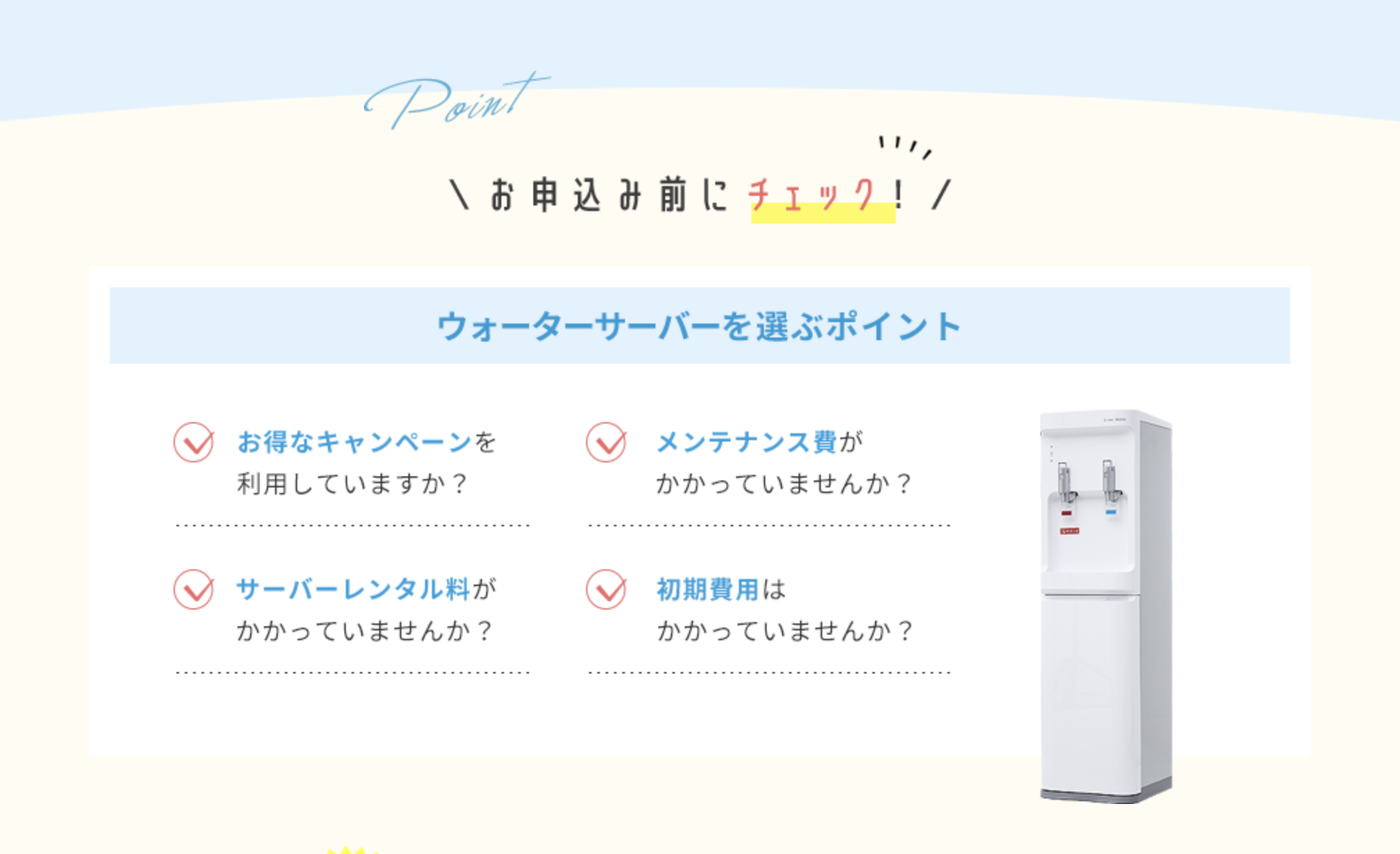 重たい水を買いに行く必要がなく、自宅まで届けてもらえるのも大きなメリットです。