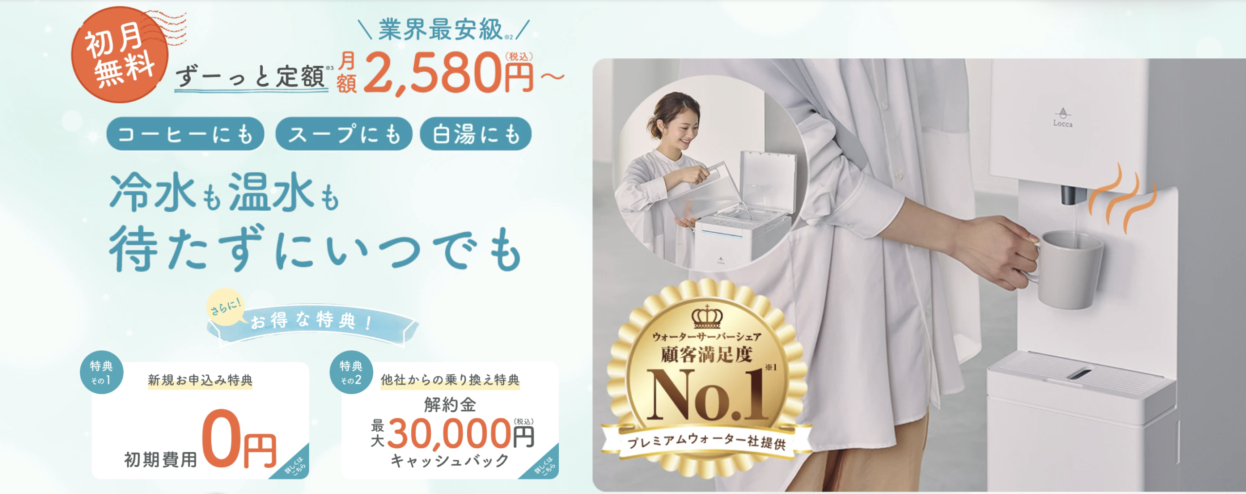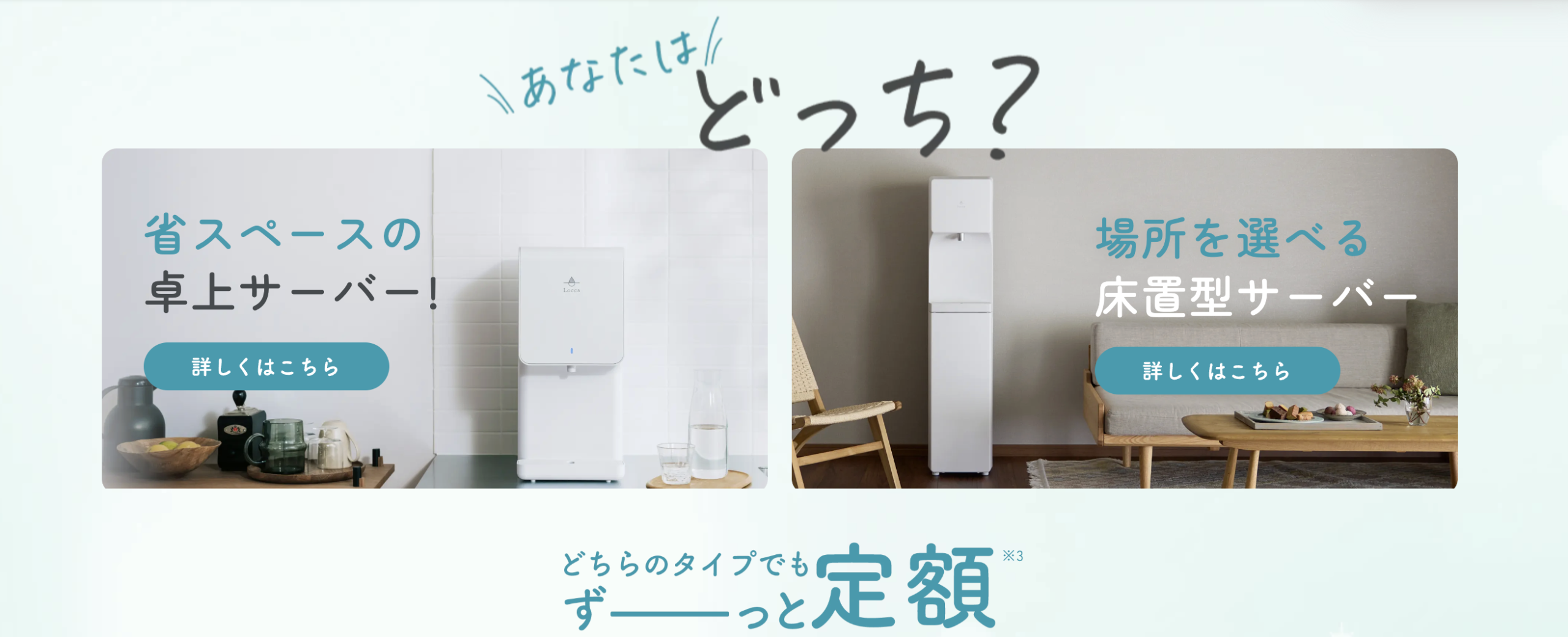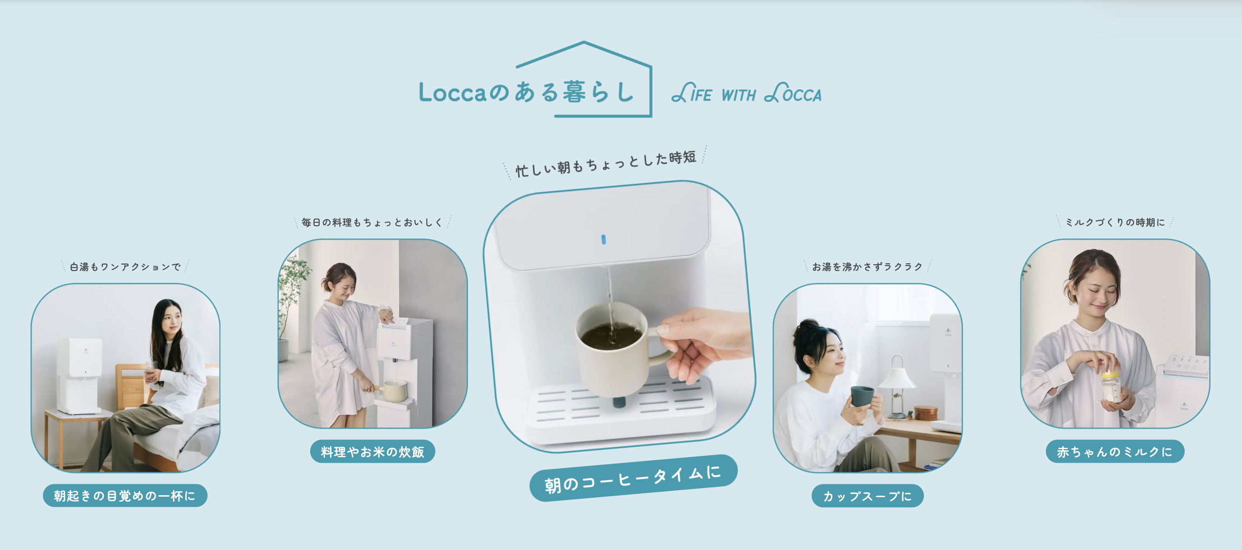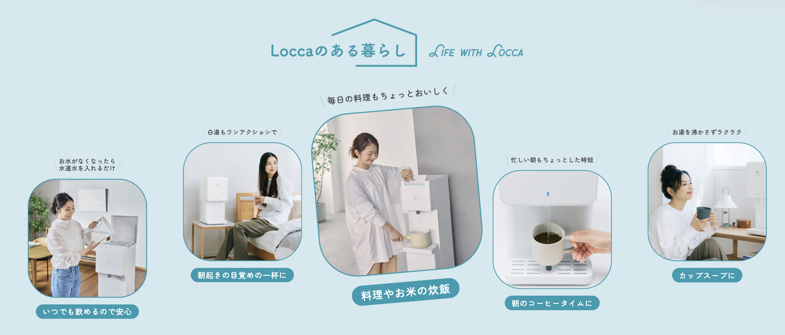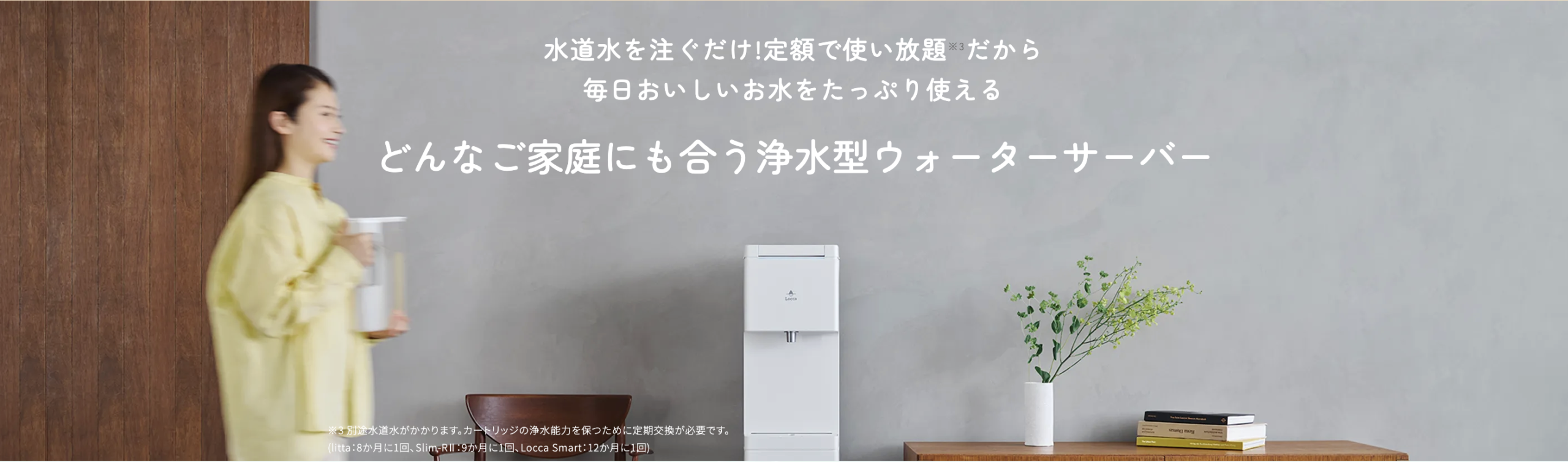 Loccaは、水道水を注ぐだけでおいしい浄水が使える「浄水型ウォーターサーバー」です。重たいボトルの交換や水の注文は不要で、毎日の生活に手軽に取り入れられるのが特長です。