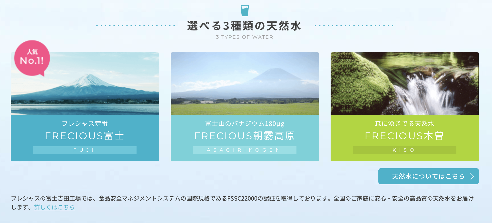 フレシャスは、富士山の恵みを活かした国産天然水を提供するウォーターサーバーサービスです。採水地の自然環境に配慮しながら、安心して飲める水を家庭やオフィスに届けています。
