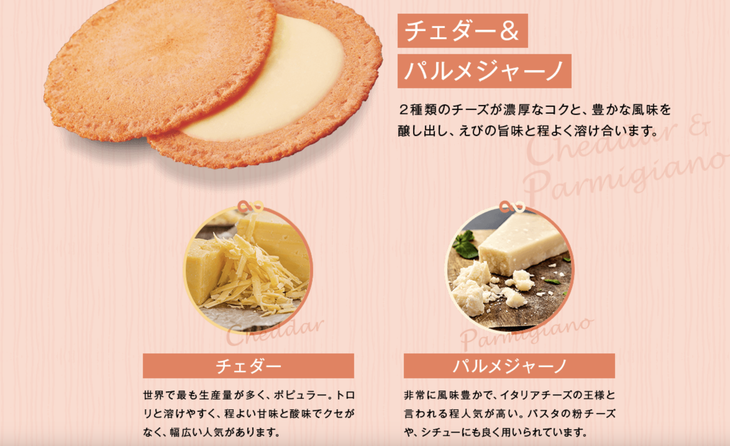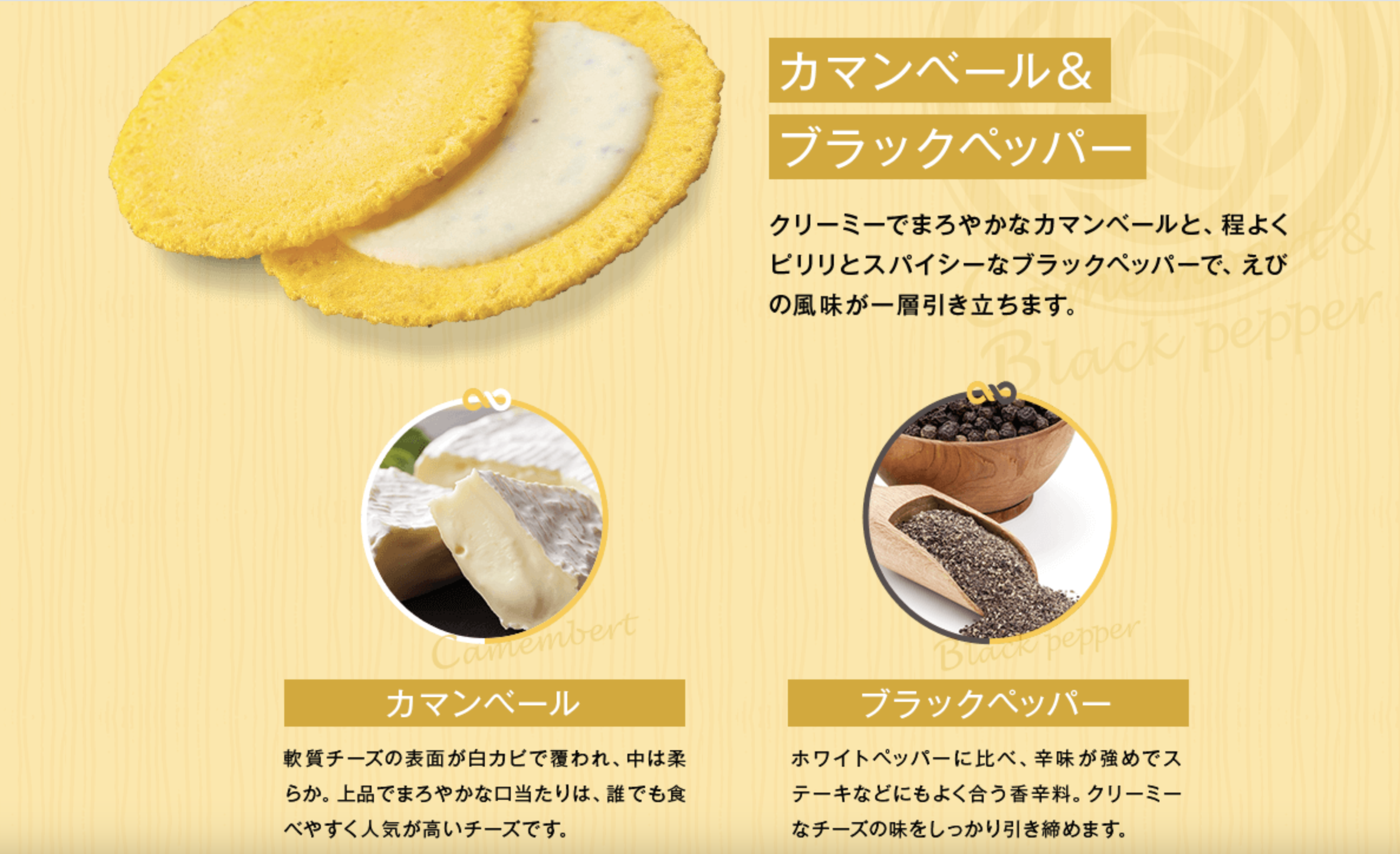 香ばしく焼き上げたえびせんに、濃厚でまろやかなチーズをサンド。