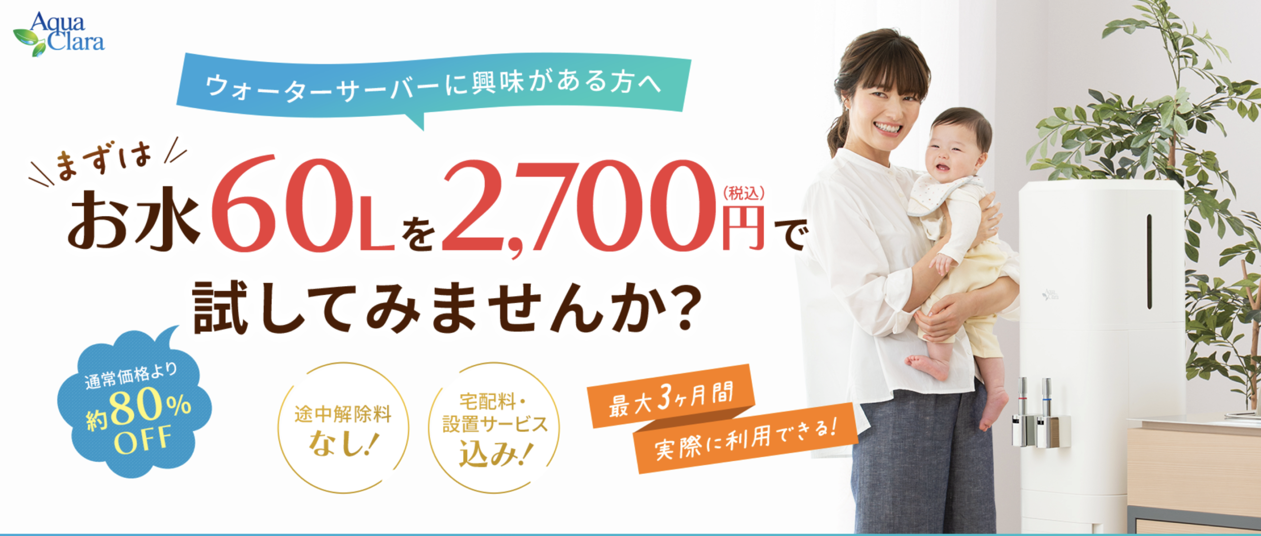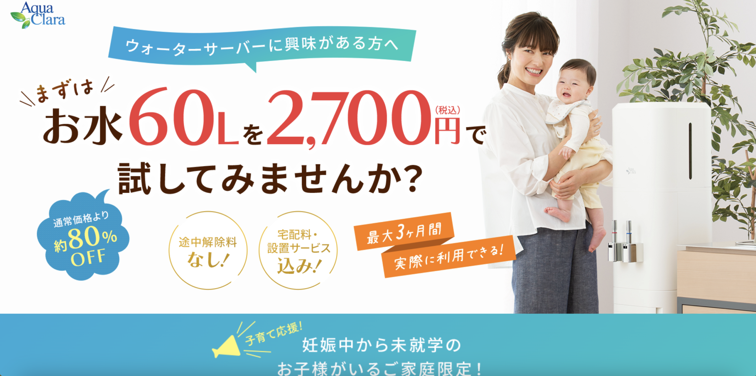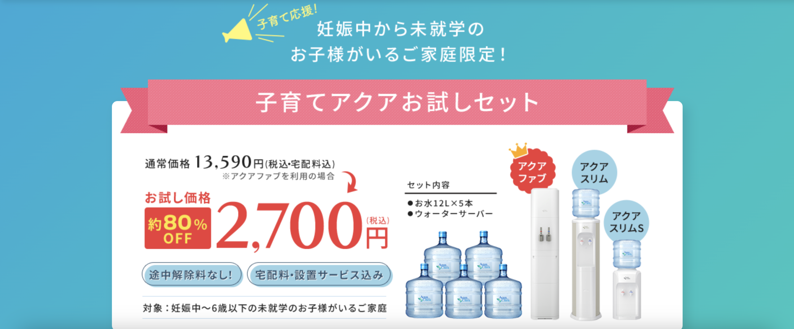 子育てアクアお試しセットは、赤ちゃんや小さなお子さまがいる家庭向けに用意された、アクアクララ公式の特別なお試しプランです。