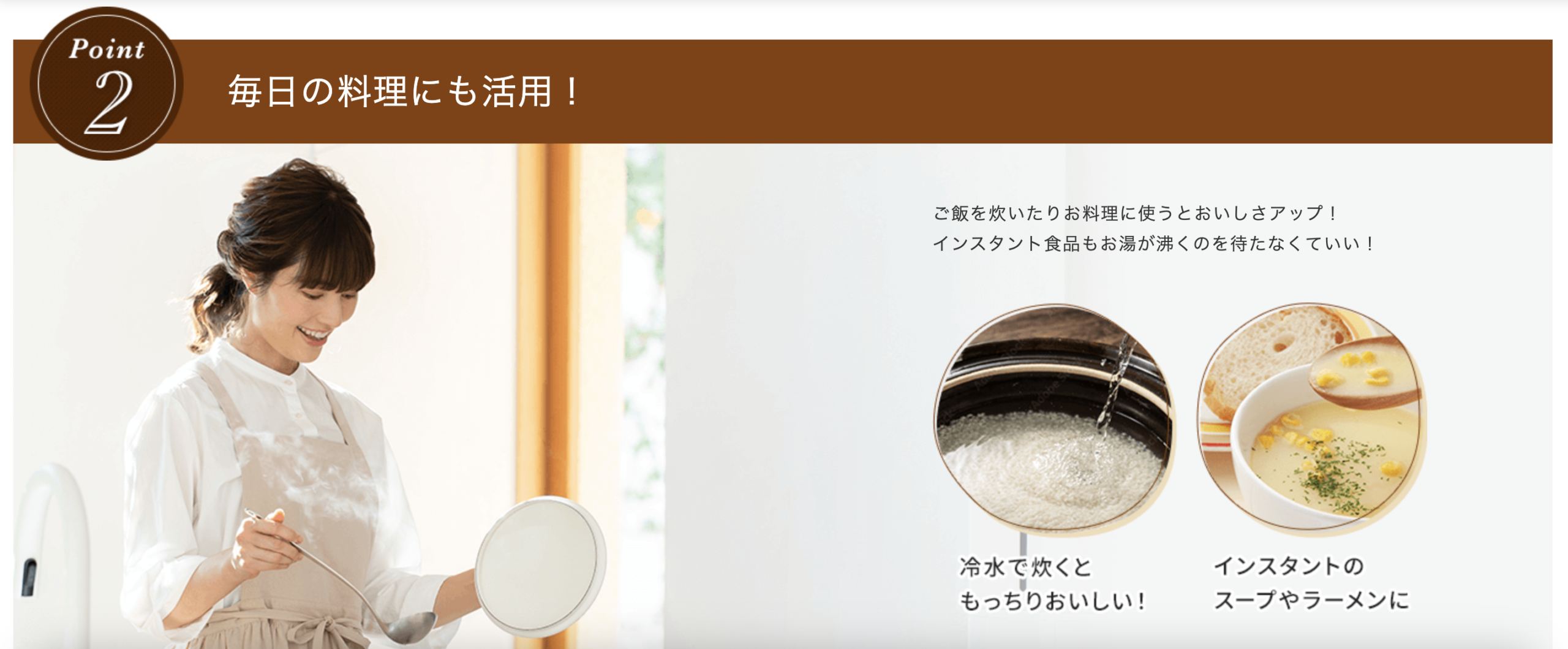ミルク作り、飲み水、料理など、日常の中で幅広く活用できます。