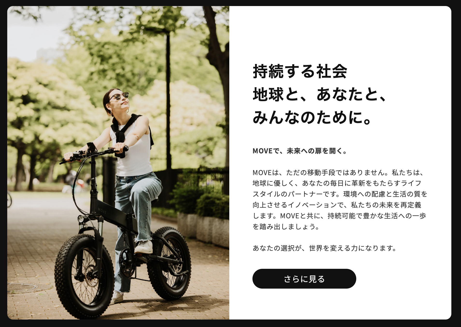 MOVE.eBikeは、「あたりまえの日常を、感動に。」をコンセプトに開発された電動アシスト自転車ブランドです。通勤・通学・買い物といった日常の移動を、より快適に、よりスタイリッシュに楽しめる一台として注目を集めています。