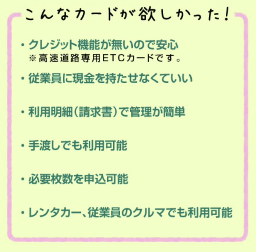 全国の有料道路で利用できるため、営業や出張が多い企業にも便利です。