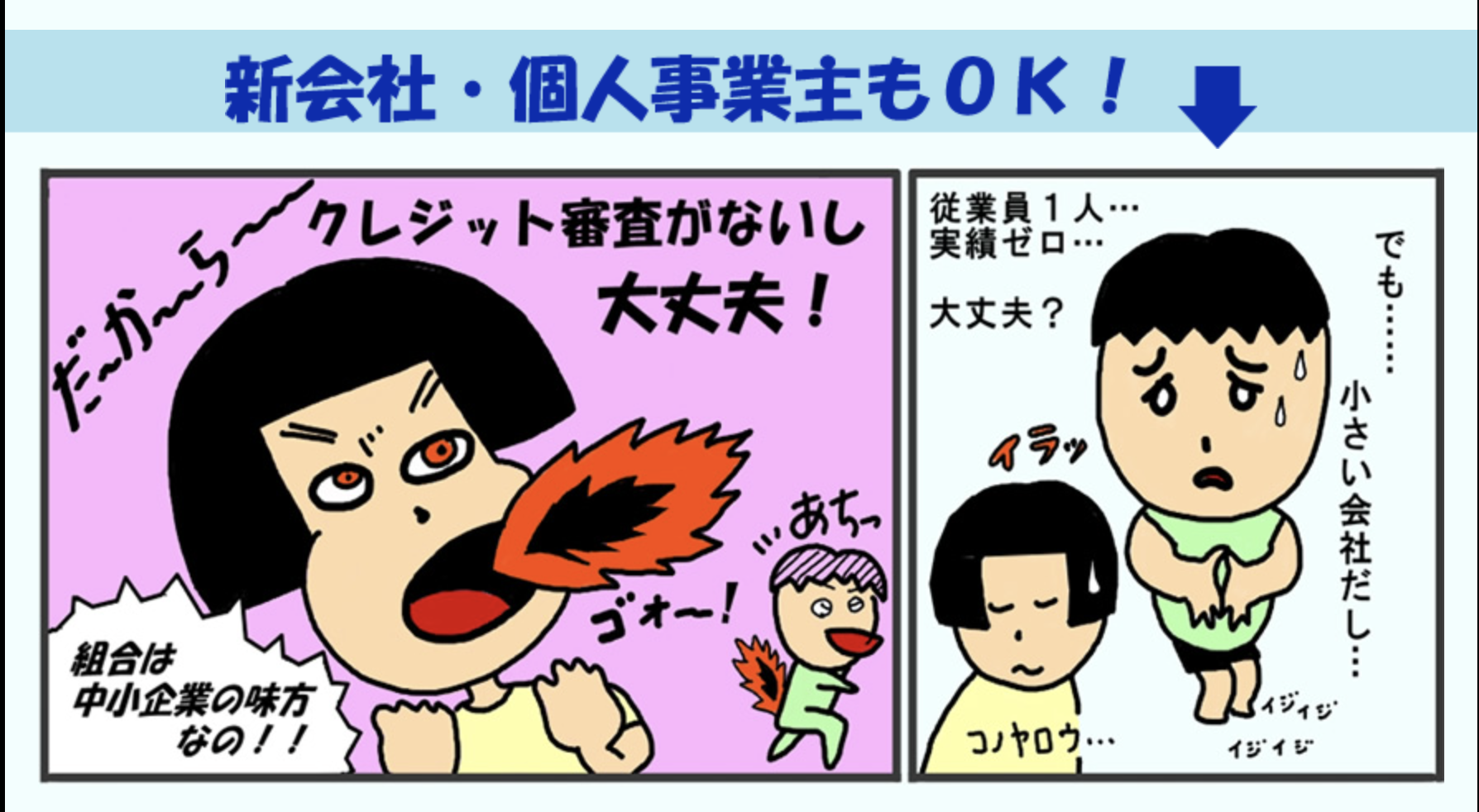 「創業したばかりでも大丈夫?」という疑問に、マンガで具体例を交えて解説。新会社でも申込み対象となる仕組みがわかりやすく説明されています。