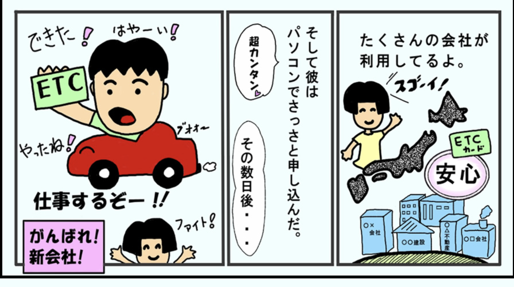 【一味違うマンガ版】新会社への発行率No.1を目指す法人ETCカードは、設立直後でも申込みしやすく、スピード発行に対応した法人向けサービスです。